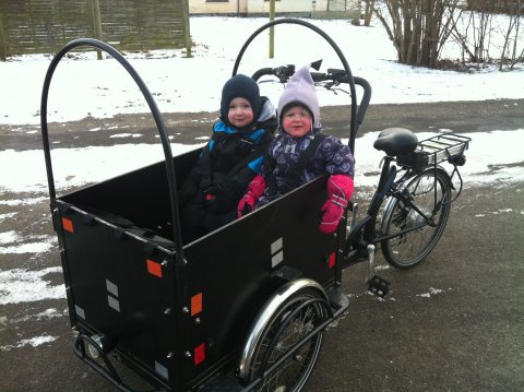 Billedet ovenover til venstre er taget på vores allerførste lille prøvetur med min el lad-cykel (feb. '12), med de 2 store jeg havde alene den dag. De syntes det var herligt!!